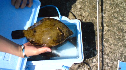 糸をたらしてまもなくカレイが釣れて、通りすがりのおじさんに「型いいね」