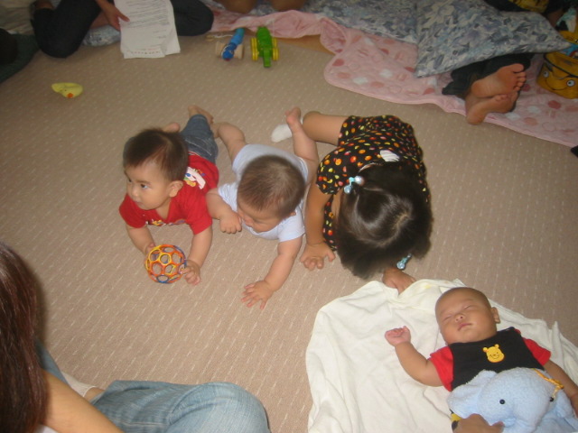 ベビーマッサージのお話をはじめると、いつもは、おもちゃなどで活発に遊んでいるのに、今日はなんだか様子が違うぞ~と、ママの側から離れなかった子どもたちも、10分も過ぎると、お部屋の外で遊びたい子、泣き出す子など、様々に活動!!