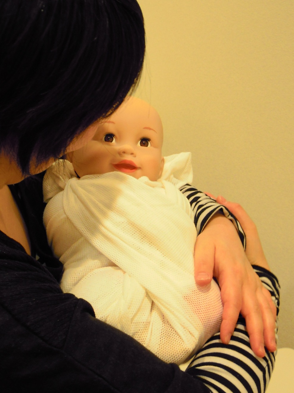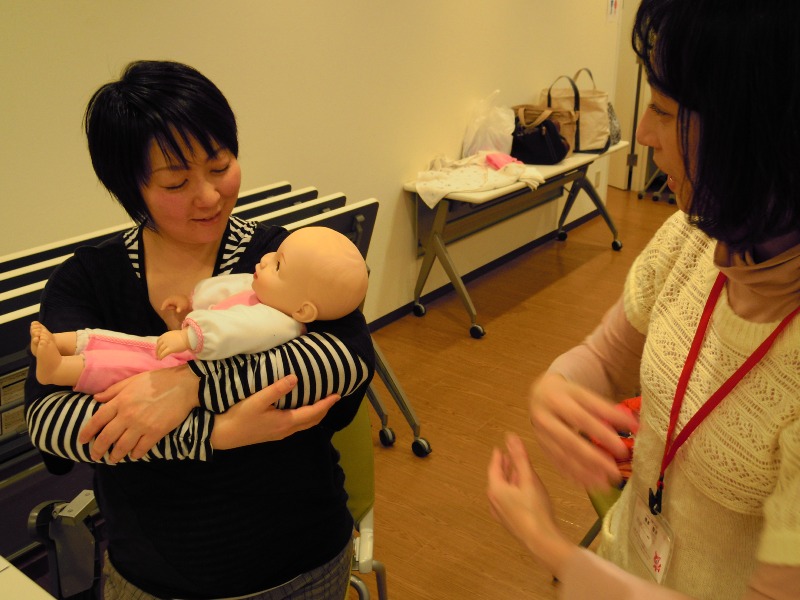 赤ちゃん人形を使って、まんまる抱っこや丸い姿勢を保つ